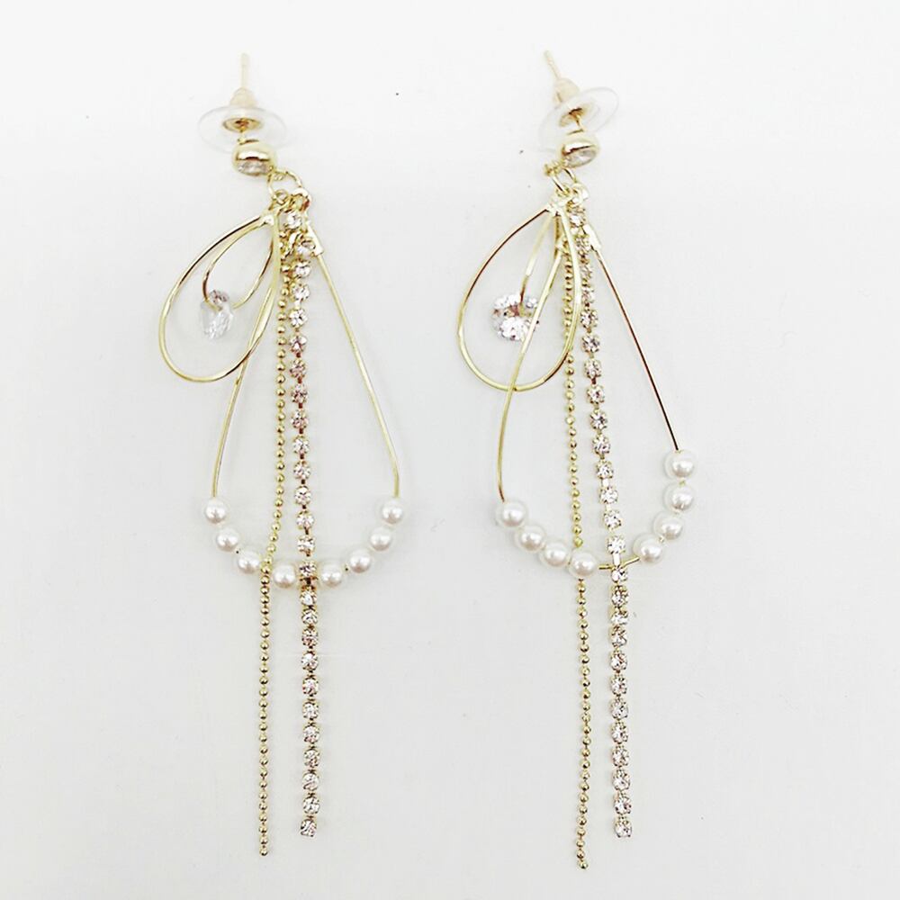 しずく型フレームにパールをつけてラインストーンチェーンを加えた大振りピアス