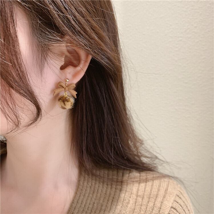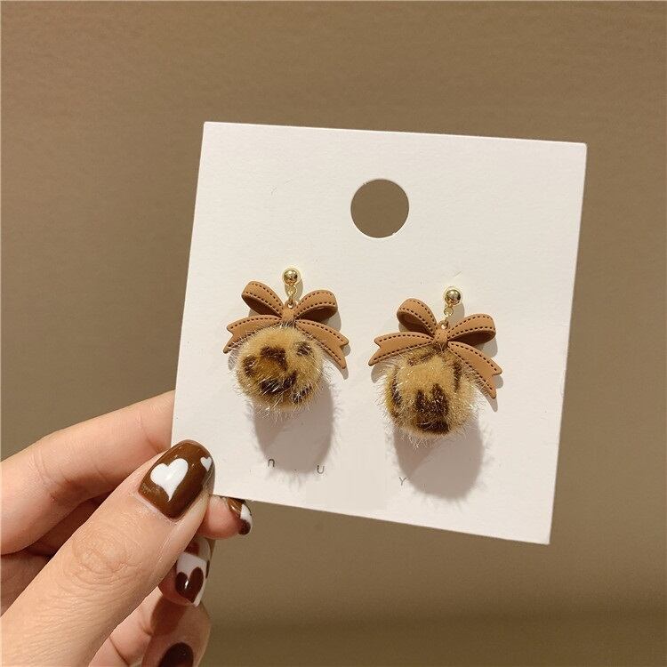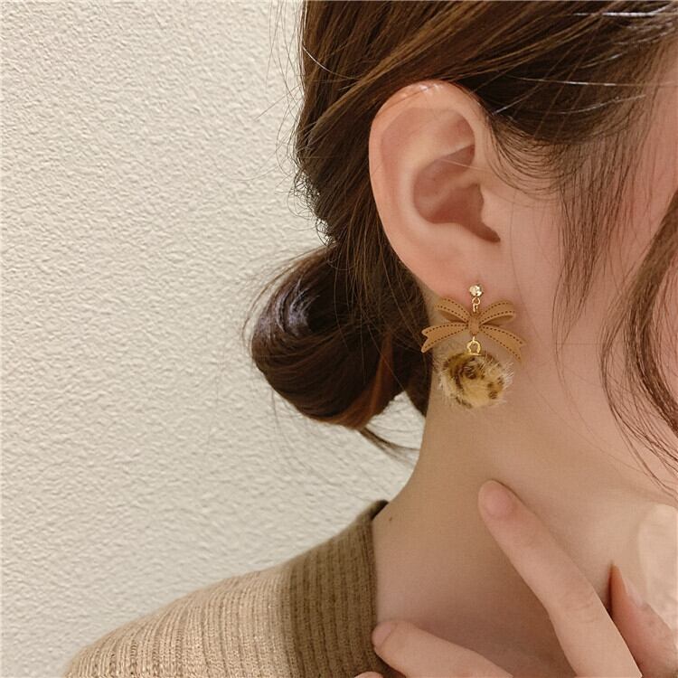 送料無料 リボンピアス ファーボールピアス ヒョウ柄